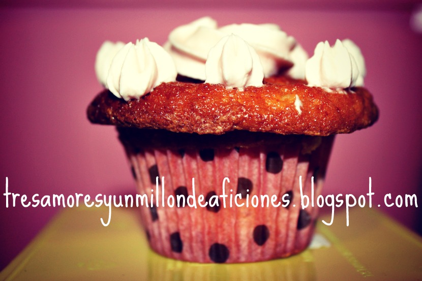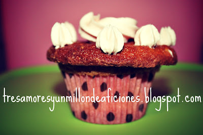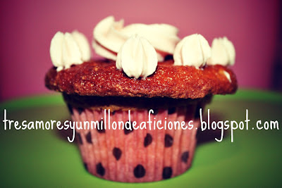 Esta vez hice la receta tal cual para no tener problemas, peeeeeeero, aunque los cupcakes hay que rellenarlos hasta los 2/3 de su capacidad, como decía que salían 12 cupcakes pues eché la cantidad que me salió en 12 cápsulas y se llenaron casi hasta el borde, y así me han quedado, que parecen setitas. Eso si, de sabor están mmmmmmmmmmmmmmmmmmmmmmmmm, deliciosos, jugosísimos, espectaculares.